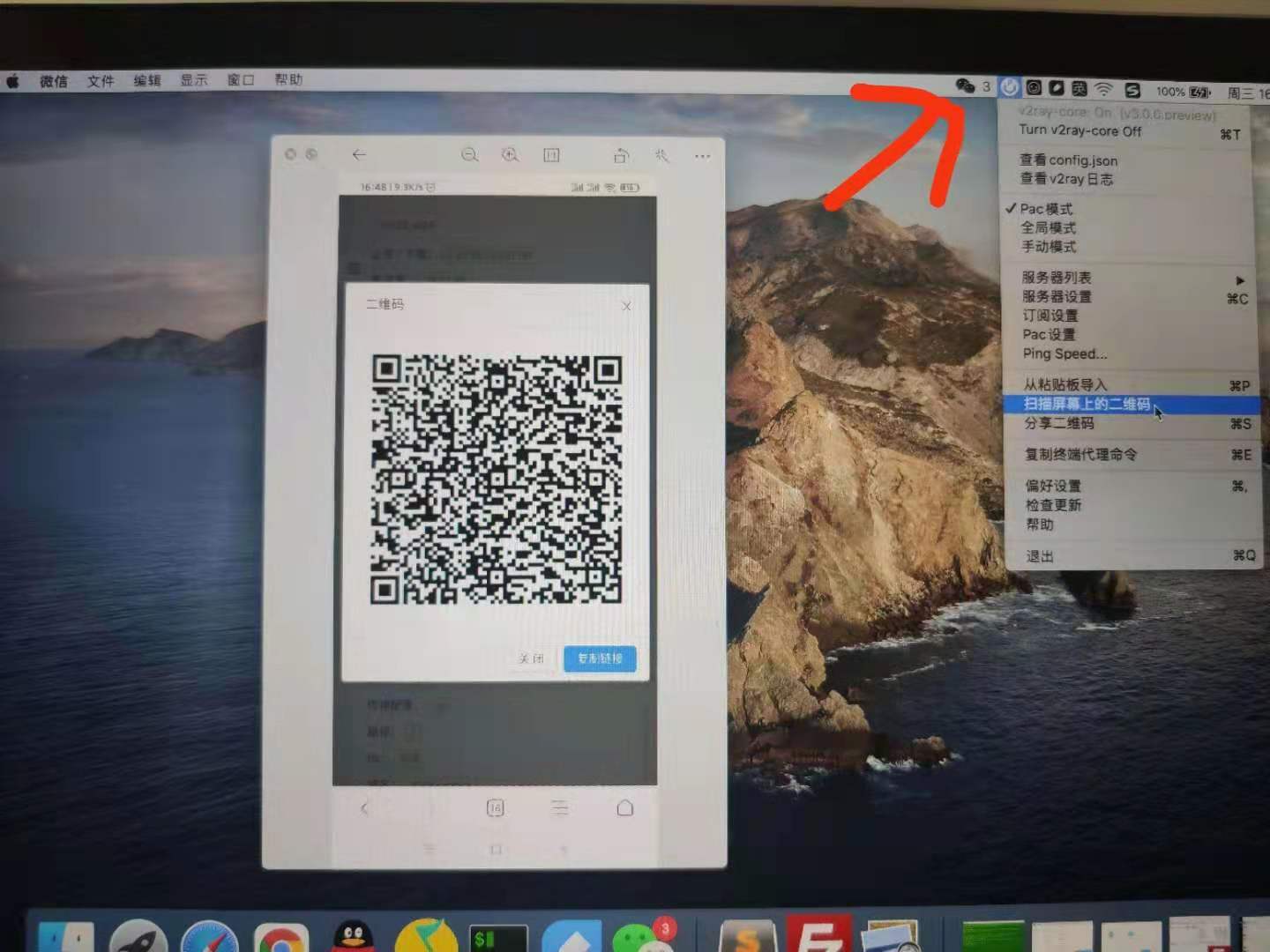 4.找我要二维码。电脑打开二维码,放大。电脑右上角,小图标,右键,扫描屏幕上二维码,如图四